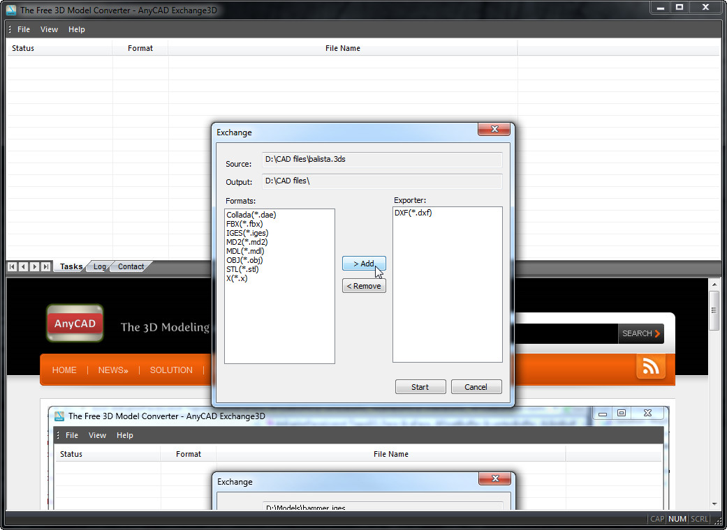 Select DXF from the left part of the window and click on the "Add" button. If you want to convert your 3DS file to multiple formats, just repeat the action selecting each of the desired file types.