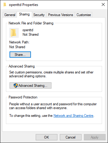 3. On the Properties window, click the Sharing tab. Then, click on the Advanced Sharing... button.