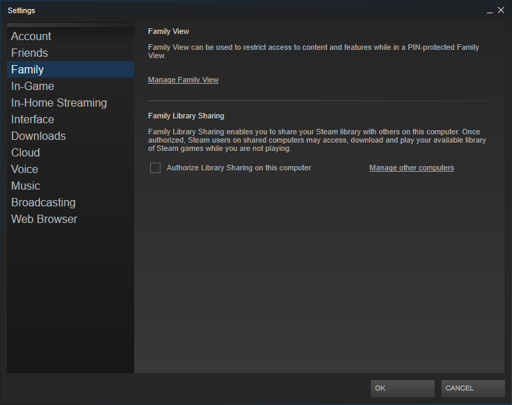 2. Now that you've finished with the Steam Guard checking or enabling procedure on your own computer, you have two ways to follow. If you want to make the game library available to other users of the same computer, while they're using their Steam accounts, go to the Steam menu and then to Settings again, but this time select the Family tab. Tick to enable the "Authorize Library Sharing on this computer" option.